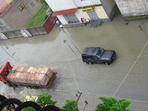 With only a moderate rain, the road in front of our house becomes a river about knee deep. Thus explaining why the shops have a steep set of steps from the sidewalk to the door. In front of the apartment building just east of us, buses pick up factory works and shuttle them to the other side of town. This morning, after a moderate rain, the water was up the bumper of the bus and as the doors opened, the first step was under water. Only a few workers made it to the buses today and the school at the corner just has a delayed opening on days like this. It is amazing how quickly things become normal – Criss did not even take pictures of today’s high water mark.