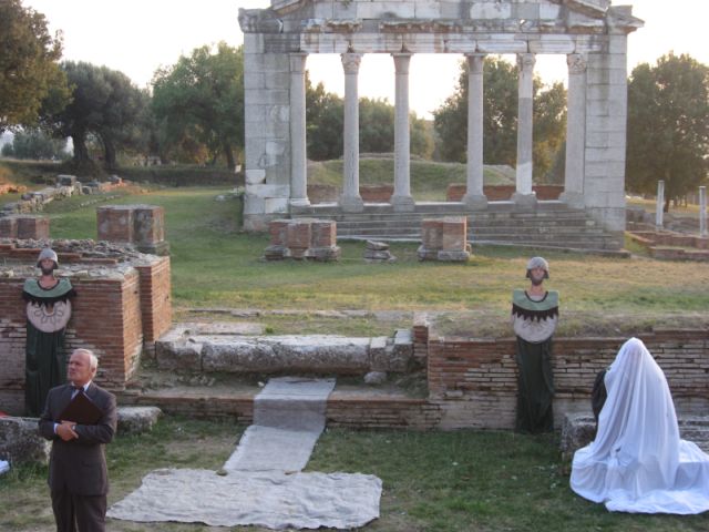 We sat in the open air, ancient amphitheatre with the columns of the bouleuterion (whatever building that was) in the background watching a beautiful sunset, waiting for the production to begin. As dusk fell, the play began and even though presented in Albanian, it was captivating. It was hard to decide whether to watch the screen with the translation or the actor.